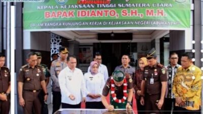 “saya ucapkan selamat datang kepada bapak Kejati Sumut Idianto, S.H, M.H. beserta rombongan di kota ika bina en pabolo Kabupaten Labuhanbatu.
