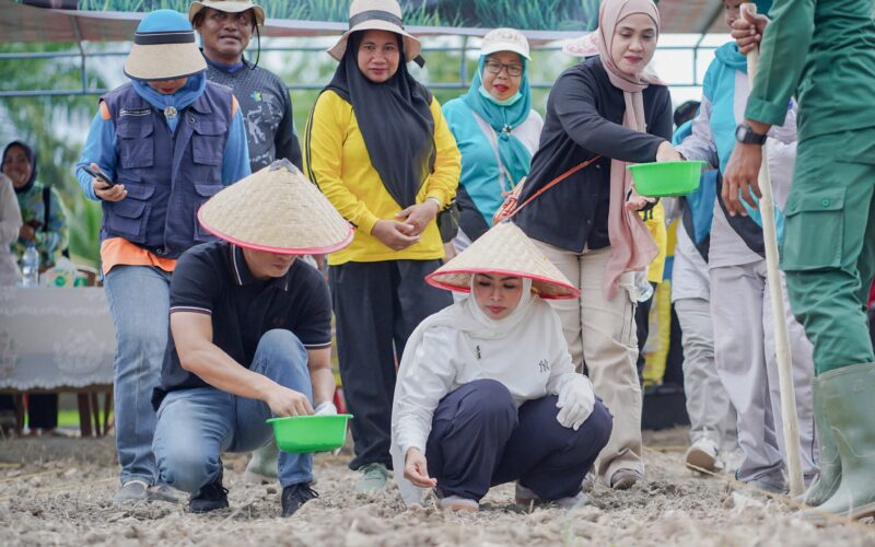 PIRNAS.COM||Labuhanbatu– Dalam rangka mendukung dan meningkatkan program ketahan pangan, Bupati Labuhanbatu dr. Hj. Maya Hasmita Sp.OG. M.KM dan Wakil Bupati Labuhanbatu H. Jamri ST bersama Dandim 0209/Lb Letkol Inf Yudi Ardian Syaputro S.IP melakukan penanaman padi darat gogo, di Desa Cinta Makmur, Kecamatan Panai Hulu. Minggu (2/11/2025).