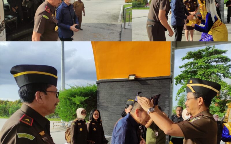 Kedatangan Jaksa Agung Muda Bidang Pengawasan Kejaksaan Agung Republik Indonesia Dr. Ali Mukartono, SH., MH dalam rangka Inspeksi Pimpinan di Wilayah Kejaksaan Tinggi Riau disambut dengan Tarian Persembahan dan pemasangan Tanjak oleh Kepala Kejaksaan Tinggi Riau Dr. Supardi.