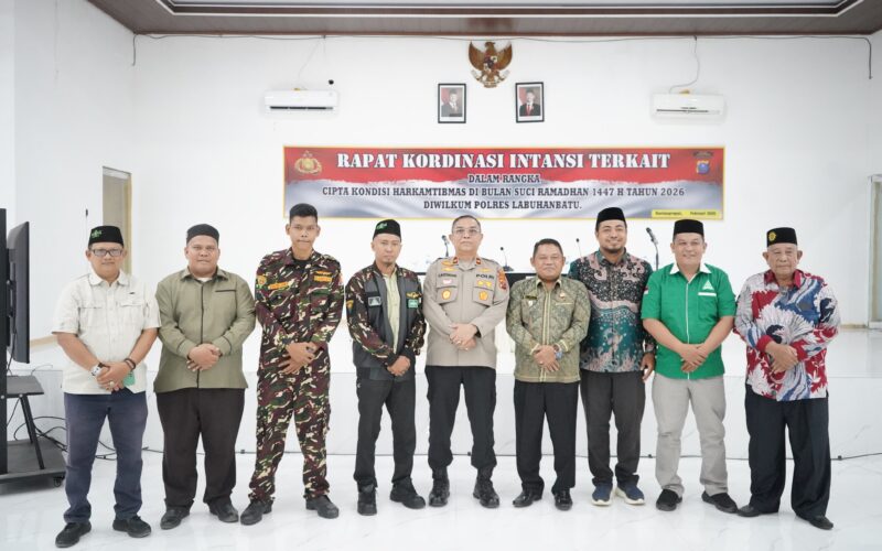 RANTAUPRAPAT,PIRNAS.COM -Menjelang datangnya bulan suci Ramadhan 1447 H, Unsur Forum Komunikasi Pimpinan Daerah (Forkopimda) Kabupaten Labuhanbatu menggelar rapat koordinasi lintas sektoral di aula Mapolres Labuhanbatu, Senin 16/2/2026. Pertemuan ini bertujuan untuk memastikan stabilitas keamanan, ketersediaan pangan, serta kenyamanan masyarakat dalam menjalankan ibadah di wilayah Labuhanbatu.