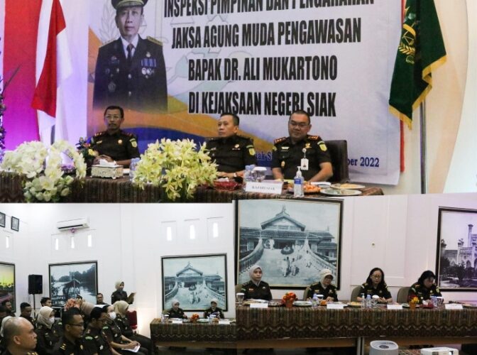 Pada kesempatan tersebut, Jaksa Agung Muda Bidang Pengawasan Kejaksaan Agung Republik Indonesia Dr. Ali Mukartono, SH., MH yang di dampingi oleh Kepala Bagian Penyusunan Program, Laporan dan Penilaian pada Sekretariat Jaksa Agung Muda Pengawasan Nur Asiah, SH., M. Hum dan Kabag TU pada Sekretariat Jaksa Agung Muda Pengawasan Waito Wongateleng, SH., MH, kedatangan Jaksa Agung Muda Bidang Pengawasan Kejaksaan Agung Republik Indonesia Dr. Ali Mukartono, SH., MH melakukan tugas dalam rangka Inspeksi Pimpinan di Kejaksaan Negeri Siak.