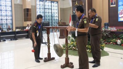 Dan selanjutnya Kepala Kejaksaan Tinggi Riau Dr. Supardi secara resmi membuka Rapat Kerja Daerah Kejaksaan Tinggi Riau Tahun 2022 yang dilakukan dengan pemukulan gong oleh Kepala Kejaksaan Tinggi Riau, Wakil Kepala Kejaksaan Tinggi Riau dan Ketua Rapat Kerja Daerah Kejaksaan Tinggi Riau Tahun 2022.