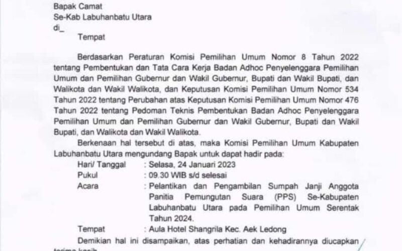 Adapun isi surat itu ialah agar para undangan hadir pada hari Selasa tanggal 23 Januari 2023 tepatnya pada pukul 09:30 Wib, dalam rangka pelaksanaan Pelantikan Dan Pengambilan Sumpah Janji Anggota PPS yang dinyatakan lulus seleksi Wawancara di Aula Hotel Shangrila, Jln. Lintas Sumut Asahan Labura di Kec. Aek Leidong, Kabupaten Asahan.