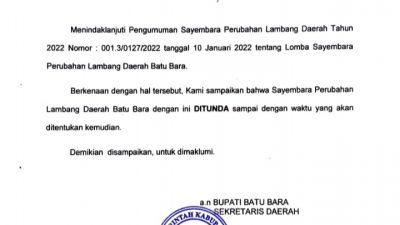 Namun sangat di sayangkan edaran sayembara Sekretariat Daerah (SETDA) Batubara nomor 001. 3 /0127/2022 //Panitia perubahan lambang daerah kabupaten Batubara ternyata menuai polemik .dan masyarakat kembali di buat bingung dengan pengumuman penundaan sayembara perubahan lambang daerah kabupaten Batubara dgn nomor 001.3/0127/2022 tanggal 10/1/2022 .