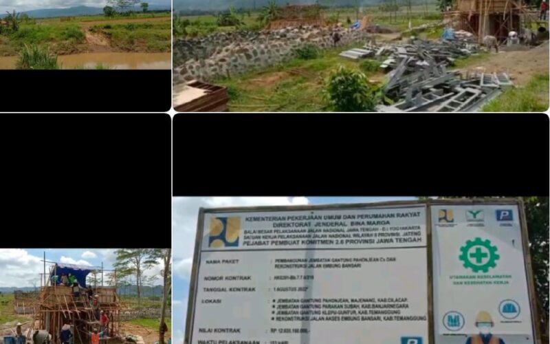 PIRNAS.COM | Cilacap – Berdasar pemantauan Tim PIRNAS dan FOKUS dilapangan pada hari Senin 19 Desember 2022. Kondisi pembagunan Jembatan Gantung Desa Pahonjean Kecamatan Majenang Kabupaten Cilacap masih dalam keadaan betantakan. Belum terlihat akan ada tanda-tanda pada tahun 2022 akan selesai.