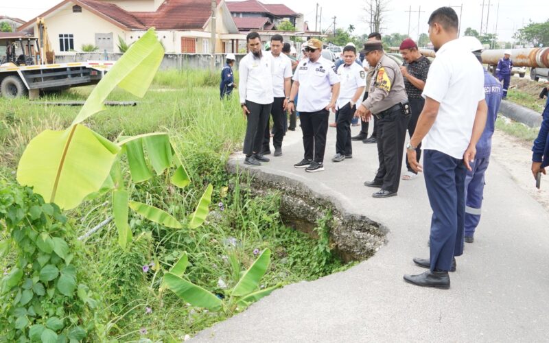 PIRNAS.COM | MANDAU –  Camat Mandau Riki Rihardi didampangi Sekretaris Kecamatan Mandau Yoan Dema meninjau proses perbaikan Jalan Seroja Kelurahan Balik Alam yang dilakukan oleh PT Pertamina Hulu Rokan (PHR), Rabu (05/04/2023).