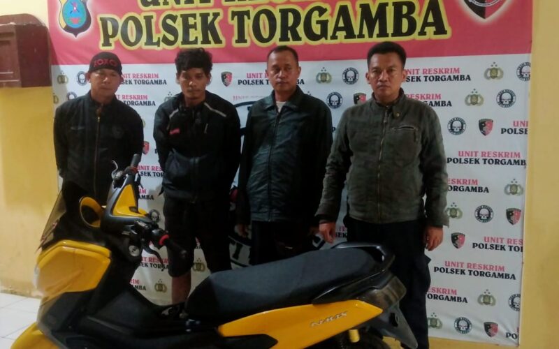 PIRNAS.COM | LABUSEL – Personil Polsek Torgamba ringkus pelaku kasus tindak pidana Pencurian sepeda motor Yamaha N-MAX Warna Kuning No. Pol BK 3154 WAJ di Hotel Garand Permata Cikampak Kabusel, Selasa (18/4/2023) sekira pukul 01.00 WIB.