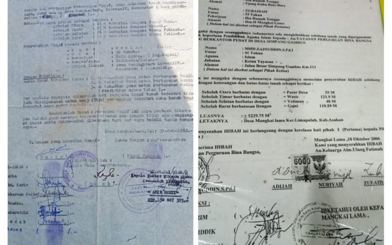 PIRNAS.COM | BATU BARA – Surat wakab untuk yayasan bina bangsa sekarang menjadi surat hibah atas nama untuk pribadi H.zainuddin yang suda menukar nama surat wakab menjadi milik pribadi nya .