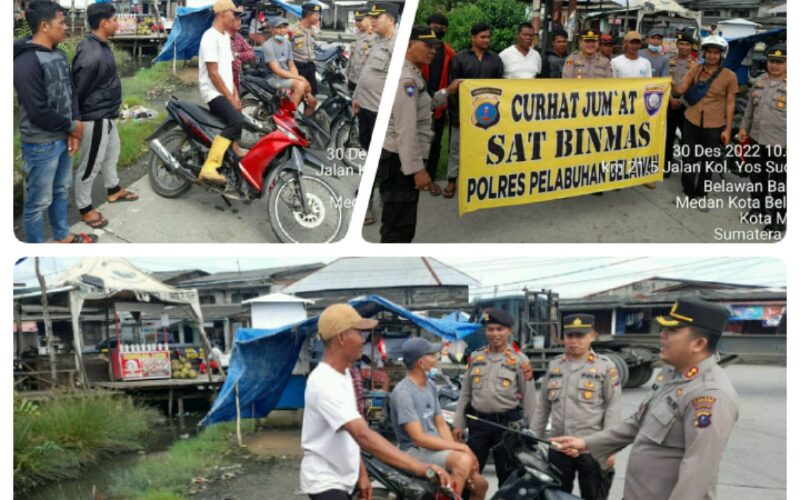 PIRNAS.COM I MEDAN – Dalam rangka untuk menampung aspirasi dan keluhan warga terkait kamtibmas serta untuk memberikan bimbingan dan penyuluhan hukum pada warga masyarakat diwilayah hukum Polres Pelabuhan Belawan. Satuan Pembinaan Masyarakat (Satbinmas) Polres Pelabuhan Belawan menggelar kegiatan Jum’at Curhat yang dipimpin langsung Kapolres Pelabuhan Belawan, AKBP Faisal Rahmat HS, SIK, SH, MH. di pangkalan ojek simpang Sicanang Belawan, Jum’at (30/12/2022) pagi.
