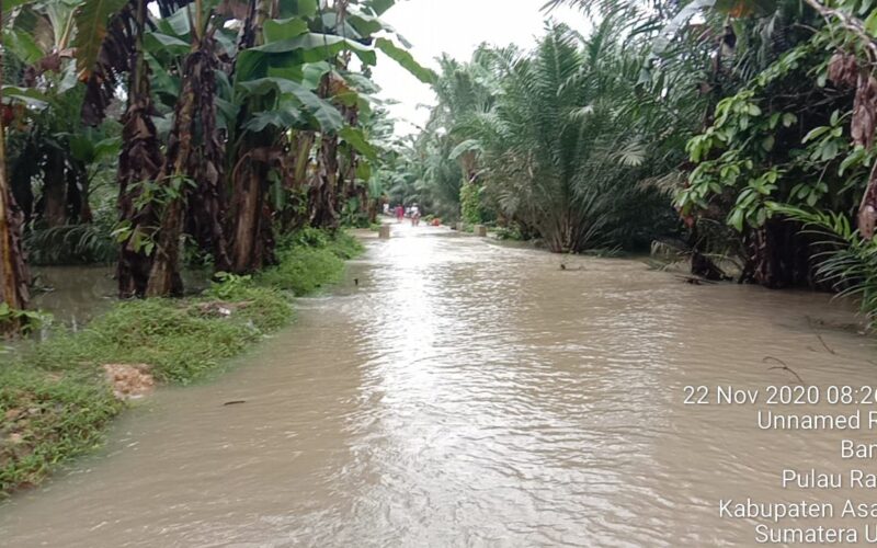 PIRNAS.COM | ASAHAN – Akibat intensitas curah hujan yang tinggi Desa Bangun Kec. Pulau rakyat, kab. Asahan yang berbatasan langsung dengan perusahaan plat merah PTP N 4 Kebun Pulu Raja mengalami kebanjiran yang menggenangi badan jalan penghubung dari dusun 3 menuju dusun 4 dan 5 yang di perkirakan se tinggi 50 hingga 60 cm.