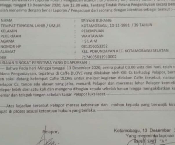 Kali ini, tindak kekerasan fisik tersebut menimpa Sriyani Buhang, wartawan Biro Kotamobagu salah satu media online Inatonreport.Com, hendak melakukan kegiatan jurnalistik, di tempat hiburan malam disalah satu tempat hiburan malam DeLove, Minggu (12/12/2020) sekitar pukul 02.00 WITA.
