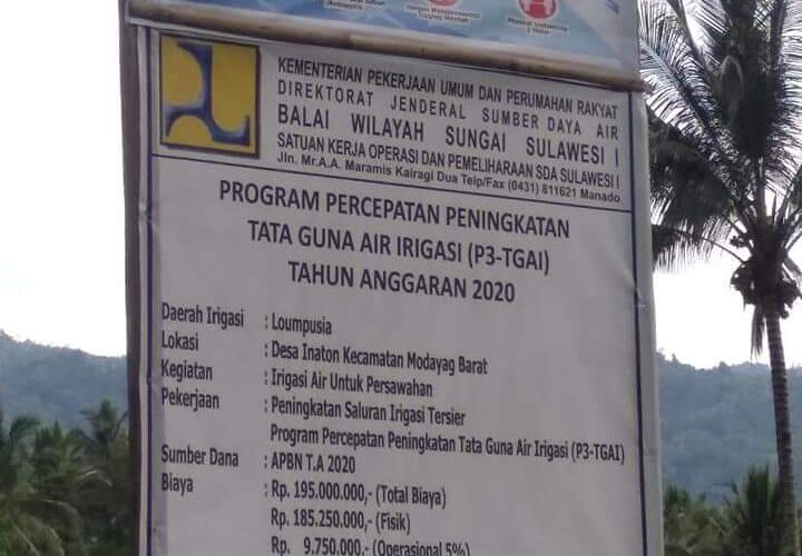 PIRNAS.COM | BOLTIM – Ucapan terima kasih kepada Anggota DPR RI Komisi V Bapak Hi Herson Mayulu, S.IP dan pihak Balai Wilayah Sungai Sulawesi I Provinsi Sulawesi Utara (Cq : PPK BWS Sulawesi I Bapak Ronald Frits Parengkuan, ST) atas terselenggaranya Bantuan Program Percepatan Peningkatan Tata Guna Air Irigasi (P3-TGAI) lewat usulan Aspirasi H2M di Desa Inaton Baliho di Pasang di lokasi kegiatan oleh Pemerintah Desa dan Kelompok P3A JATI Desa Inaton Kecamatan Modayag Barat Kabupaten Bolaang Mongondow Timur.