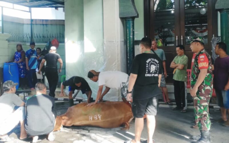 PIRNAS.COM | Surakarta – Babinsa Kelurahan Kratonan Koramil 03/Serengan Kodim 0735/Surakarta Koptu Resbiyanto bersama linmas Pukul 08.00 hingga selesai melaksanakan Komunikasi Sosial (Komsos) dengan berbaur dan membantu masyarakat pemotongan hewan kurban di Masjid Al-Hikmah Jl. Gatot Subroto No. 249 Kel. Kratonan Kec. Serengan Kota Surakarta (29/06/2023)