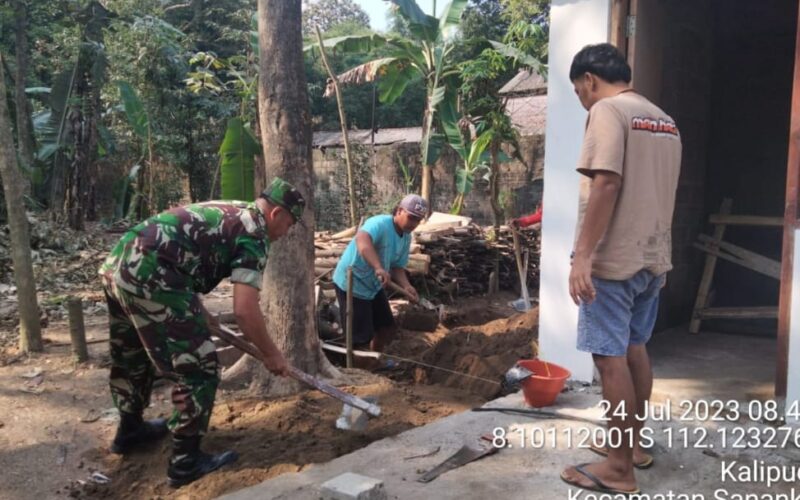 PIRNAS.COM | Blitar – Babinsa Koramil 0808/04 Sanankulon Kodim 0808/Blitar Serka Ponidi bersama warga masyarakat, melaksanakan kegiatan kerja bakti dan gotong royong membantu merehab rumah warga kurang mampu atas nama Bapak Lutfi Purwanto, bertempat di Dusun Sumberbuntung RT. 003 RW. 008 Desa Kalipucung Kec. Sanankulon Kab. Blitar, Senin (24/7/2023).