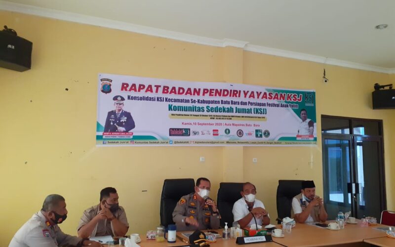 PIRNAS.COM | MEDAN – Komunitas Sedekah Jum’at (KSJ) binaan AKBP Pol H.Ikhwan Lubis, SH, MH yang saat ini menjabat sebagai Kapolres Batubara menggelar rapat badan pendiri Yayasan Komunitas Sedekah Jum’at (YKSJ) yang berlangsung di ruang rapat Mapolres Batubara dan dibuka langsung oleh Pendiri sekaligus Pembina Utama AKBP Pol H.Ikhwan Lubis, SH, MH. Rabu (10/09/2020).