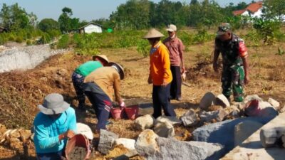 PIRNAS.COM | Sragen – Sertu Sunarto Babinsa Desa Blimbing anggota Koramil 08/ Sambirejo Kodim 0725/Sragen bahu-membahu melaksanakan gotong-royong pembuatan tanggul penahan jalan di dk Bangun rejo Rt 01 Ds Blimbing Kec Sambirejo, Kamis ( 27/07/2023 )