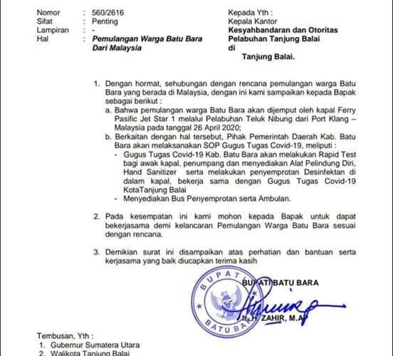 Dalam surat tersebut Bupati Batu Bara mengatakan, bahwa pemulangan warga Batu Bara akan dijemput oleh kapal ferry Pasific Jet Star 1 melalui pelabuhan Teluk Nibung dari Port Klang – Malaysia pada 26 April 2020.