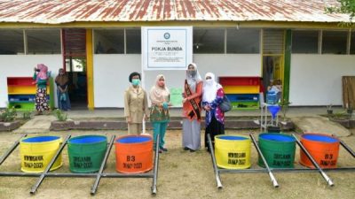 Setelah selesai memberikan bantuan dan berinteraksi dengan anak-anak TK. Bunda Maya Zahir menyalurkan bantuan Tong Sampah dari Dinas Lingkungan Hidup.