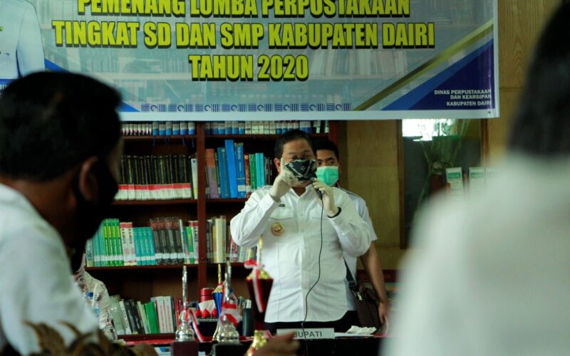 PIRNAS.COM | DAIRI – Bupati Dairi, Dr. Eddy Keleng Ate Berutu serahkan hadiah dan uang pembinaan kepada para pemenang lomba Perpustakaan tingkat SD dan SMP se-kabupaten Dairi, Rabu (25/11/2020) di Kantor Dinas Perpustakaan dan Kearsipan Kabupaten Dairi.