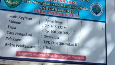 Terkait hal ini diminta kepada Inspektorat Madina agar mengaudit Anggaran Dana Desa 2019 Desa Sinunukan II Kec.Sinunukan Kab.Madina apabila ada indikasi kerugian Negara agar melakukan penindakan sesuai dengan undang-undang di Negara Kesatuan Republik Indonesi.