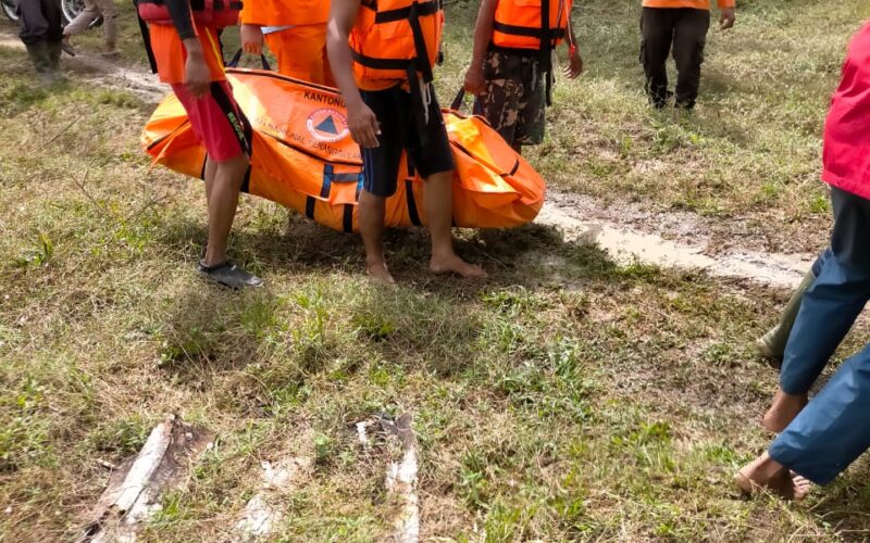 Sekira pukul 10.45 Wib, Korban di temukan telah meninggal dunia sekitar 200 Meter dari lokasi awal Korban Hanyut.