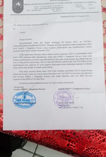 Surat konfirmasi melalui media detektif swasta yang merupakan Tim dari Media ini pada saat itu, sudah melayangkan surat kepada kepala sekolah SMKN 1 Pangkalan Kerinci Nurasia, M.Pd yang dimana suratnya juga diketahui oleh ketua komite sekolah SMKN 1 Pangkalan Kerinci, Armansyah Harahap, SH. Pada surat konfirmasi terlebih Kepsek terlihat enggan dalam memberikan jawaban yang sesuai dengan apa yang dipertanyakan oleh awak Media.