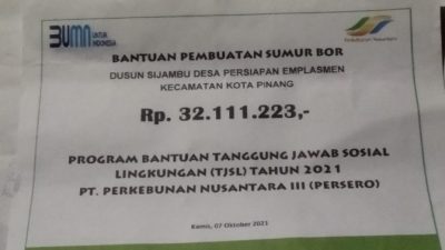PIRNAS.COM | LABUSEL – Di hari Kamis 07 Oktober 2021 masyarakat Dusun Sijambu mendapat Bantuan Pembuatan Sumur bor dari Program Bantuan Tanggung Jawab Sosial Lingkungan (TJSL) PT. Perkebunan Nusantata III (PERSERO) Distrik Labuhanbatu III.