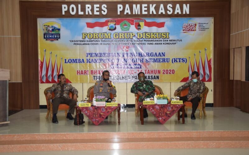 Kapolres Pamekasan AKBP Djoko Lestari, S.I.K., M.M melalui Kasubbaghumas Polres Pamekasan, AKP Nining Dyah PS menjelaskan, bahwa kegiatan FGD tersebut dilaksanakan dalam rangka Eksistensi Kampung Tangguh Semeru (KTS) dalam penanganan dan memutus penularan Covid-19 guna terciptanya Kamtibmas yang aman dan kondusif.