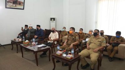 Bupati Asahan H.Surya bersama pejabat di lingkungan Pemerintah Kabupaten Asahan mengikuti video conference bersama Gubernur Sumatera Utara di ruang kerja Bupati Asahan.