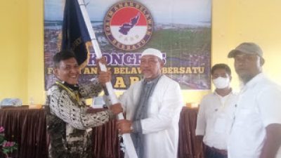 PIRNAS.COM | MEDAN – H. Irfan Hamidi selaku Ketua Dewan Pendiri Forum Anak Belawan Bersatu (FABB) menyerahkan bendera pataka kepada Ketua umum FABB terpilih Rahmad Chairil Chaniago untuk masa bakti 2020 – 2023 usai acara kongres FABB yang digelar di Aula kantor kecamatan Medan Belawan, Sabtu (17/10/2020).