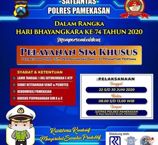 PIRNAS.COM | PAMEKASAN – Satlantas Polres Pamekasan, Madura, Jawa Timur Gratiskan perpanjangan SIM A dan C, hal ini dilakukan dalam rangka Sambut Hari Bhayangkara Polri ke-74 tahun 2020 yang bertepatan pada tanggal 1 Juli 2020, Rabu (17/06/2020).