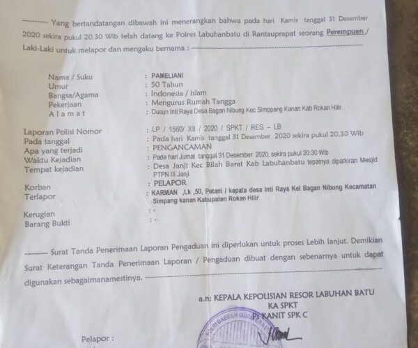 Ibu Pameliani mengatakan kepada awak media ini, dengan mengeluarkan air mata atas kejadian yang menimpa dirinya, pada Tanggal 31 Desember 2020 yang lalu, di jalan lintas kebun Janji Rantau Prapat. Kejadian tersebut dilaporkan korban ke Polres Lab.Batu Rantau Prapat dengan no: STPL/1540/YAN/2, 5/XIl/220/SPKT/RES-LB. Pada Tanggal 31 Desember 2021 atas nama pelapor Pameliani (50 thn) Penduduk warga Inti Raya, Desa Bagan Nibung, Kecamatan Simpang Kanan.