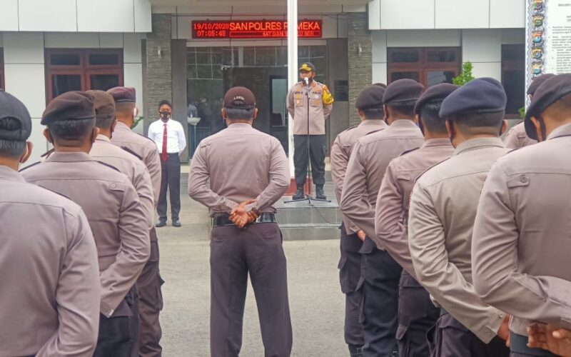 Senin (19/10/2020) pagi, Kapolres Pamekasan AKBP Apip Ginanjar, S.I.K., M.Si pimpin langsung giat apel pagi serta memberikan secara langsung sosialisasi ke internal Polri terkait pembangunan Zona Integritas.
