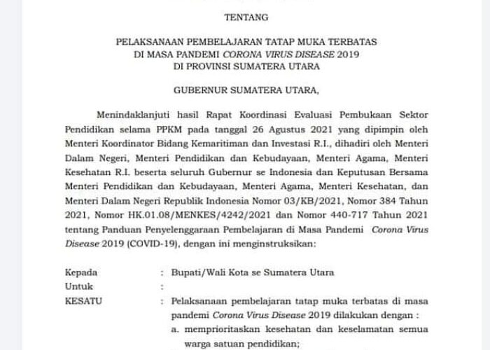 Menindak lanjuti hasil rapat koordinasi evaluasi pembukaan sektor pendidikan selama PPKM yang tertanggal 26 Agustus 2021,yang di pimpin oleh Menteri koordinator bidang kemaritiman dan investasi RI yang di hadiri menteri dalam negeri, Menteri pendidikan dan kebudayaan, Menteri Agama, Menteri Kesehatan, dan Menteri Dalam Negeri RI nomor. 03/ KB/2021, nomor 384 tahun 2021, no. HK. 01.08/MENKES/4242/2021, dan nomor 440.717 tahun 2021 tentang panduan penyelenggaraan pembelajaran di masa pandemi COVID-19 yang keseluruhan nya ada sekitar 8 point yang di instruksikan oleh GUBSU Edy rahmayady, pemkab Labuhan batu menghimbau antara lain :