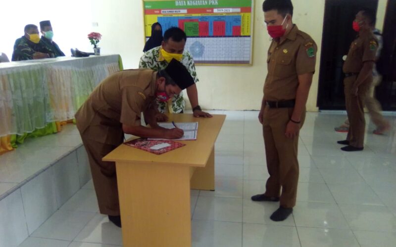 Pada pukul 11.30 WIB, Kepala Desa Sumber Mulyo menandatangani salah satu SK perangkat desa tersebut.
