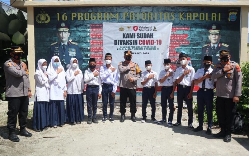 Kapolres Batu Bara menyampaikan, “Tetap patuhi protokol kesehatan 5 M walaupun kita sudah divaksin. Hari ini kita juga melaksanakan vaksinasi kepada para pelajar untuk menambah imun tubuh para pelajar kita yang akan mengikuti kegiatan belajar tatap muka secara menyeluruh.”
