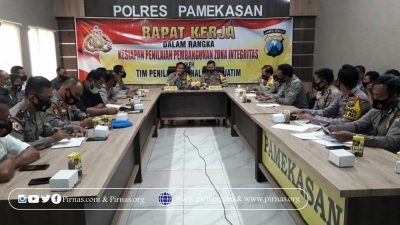 PiRNAS.COM | PAMEKASAN – Kepolisian Resort Pamekasan, Madura, Jawa Timur, gelar rapat kerja dalam rangka kesiapan penilaian pembangunan Zona Integritas oleh Tim Penilai Internal Polda Jatim.
