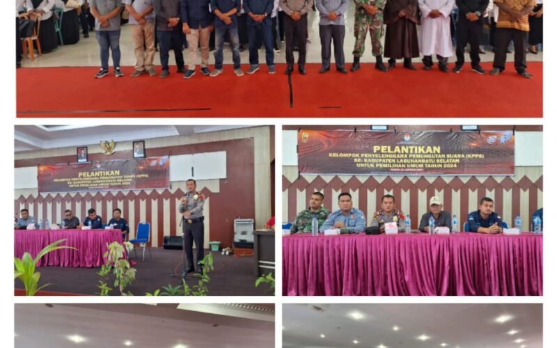 Pirnas.com | Kotapinang – Kapolres Labuhanbatu Selatan AKBP MARINGAN SIMANJUNTAK, S.H.,M.H., yang diwakili oleh Kapolsek Kotapinang AKP Dr. Krisnat Indratno, S.E.,M.H., menghadiri pelantikan Kelompok Penyelenggara Pemungutan Suara (KPPS) pada Pemilu 2024 se-Kecamatan Kotapinang Kabupaten Labuhanbatu Selatan yang diadakan di Aula Santun Berkata Bijak Berkarya (SBBK) jalan Bukit Kotapinang Kelurahan Kotapinang Kecamatan Kotapinang Kabupaten Labuhanbatu Selatan Propinsi Sumatera Utara, Kamis (25/1/2024).
