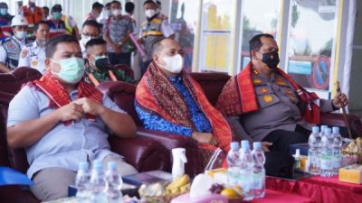 Kapolsek Indrapura AKP SANDY, Kasubbag Humas Polres Batu Bara, AKP NIKO SIAGIAN, ST., SH.Personil Polres Batu Bara yang tersprint.Dalam rangka Pengalungan Kain Ulos. Berjalan menuju papan display dan pemaparan (walking presentation).