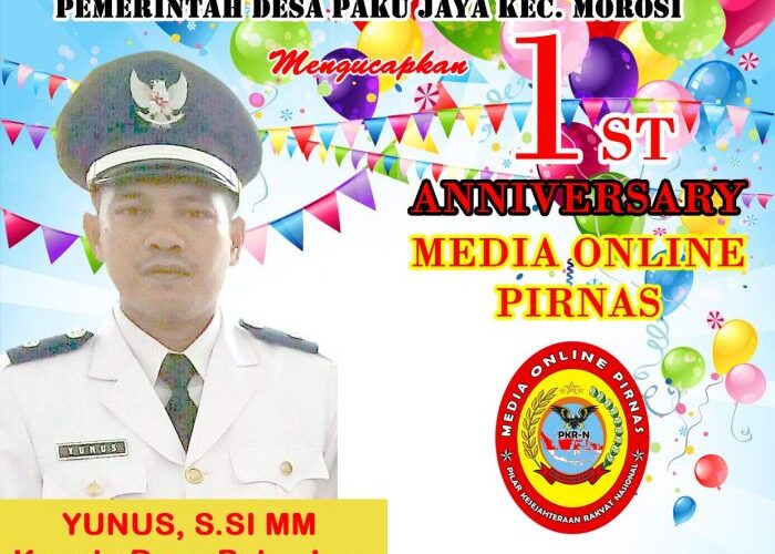 PIRNAS.COM | KONAWE – Kepala Desa Paku Jaya, Kecamatan Morosi, Kabupaten Konawe, Provinsi Sulawesi Tenggara mengucapkan, “Selamat HUT ke-1 Media PIRNAS”, 15 Agustus 2020, dan Dirgahayu Kemerdekaan Republik Indonesia ke-75 tahun, 17 Agustus 2020. Ucapan selamat tersebut disampaikan langsung Yunus S.Si, MM, sebagai kepala desa di kediamannya, Sabtu (15/5/2020).