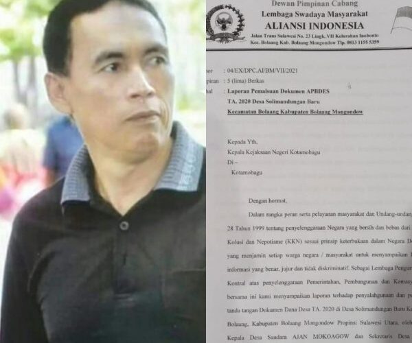Dalam rangka peran serta pelayanan masyarakat dan UU nomor 29 Tahun 1999 tentang penyelenggaraan negara yang bersih dan bebas dari korupsi. Lembaga swadaya Masyarakat Aliansi Indonesia telah menyurati ke kejaksaan negeri Kotamobagu perihal keterlibatan salah satu oknum kepala desa (AM) dan sekretaris desa (TS), mengenai dugaan penyalah gunaan dana desa yang telah merugikan Negara ratusan juta rupiah,” tandas Yusuf