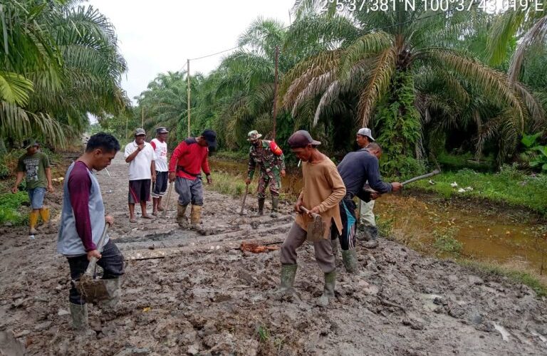 PIRNAS.COM | ROHIL – Babinsa Koramil 04/Kubu Serma Sriyono melakukan giat gotong royong bersama masyarakat di Kepenghuluan Teluk Piyai Kecamatan Kubu pada Minggu, (10/01).