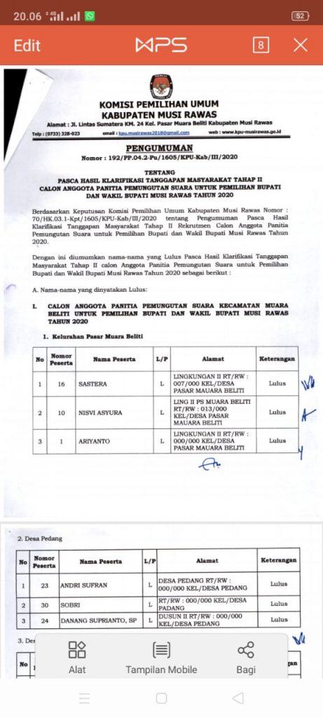 Adapun nama-nama yang lulus pasca hasil klarifikasi tanggapan masyarakat tahap II calon anggota PPS adalah sebagai berikut :