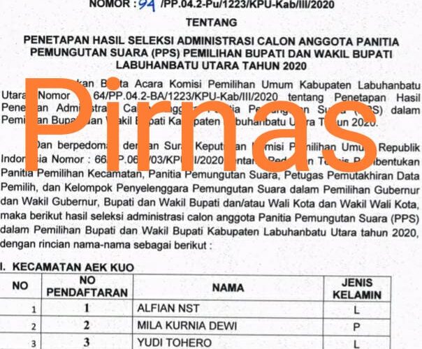 PIRNAS.COM & PIRNAS.ORG | LABURA – Komisi Pemilihan Umum Kabupaten Labuhanbatu Utara telah mengumumkan hasil  seleksi administrasi Calon Anggota Panitia Pemungutan Suara (PPS) Pemilihan Bupati Dan Wakil Bupati Labuhanbatu Utara Tahun 2020 pada tanggal  (2/3/2020).