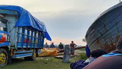 Mobil yang berisikan Balpres di amankan Bea cukai di lokasi seusai dipindahkan dari sampan ke mobil Truk Cool Diesel.
