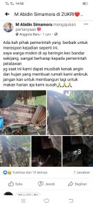 PIRNAS.COM | PELALAWAN – Berawal dari unggahan akun FB M Abidin Simamora mengajukan pertanyaan dalam group Facebook “Zukri Nasar Pelalawan Grup” tanggal 03/08/2021 pada jam 13:51:09, “Adakah pihak pemerintah yang berbaik untuk merespon kejadian seperti ini, saya warga miskin di sp bringin kec. Bandar Sikijang sangat berharap kepada pemerintah Pelalawan yang saat ini kami dapat musibah kenak angin dan hujan yang membuat rumah kami ambruk. Jangan kan untuk membangun lagi untuk makan harian aja kami susah”.