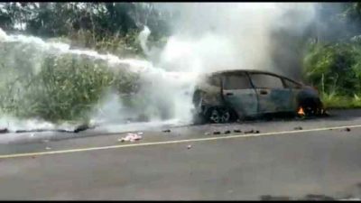 PIRNAS.COM | MUSI RAWAS – Pengguna Jalan Lintas Sumatera dan Warga Desa Simpang Gegas Temuan, Kecamatan TPK, Kabupaten Mura, mendadak heboh lantaran mobil Honda Jazz BG 1237 HO, terbakar.