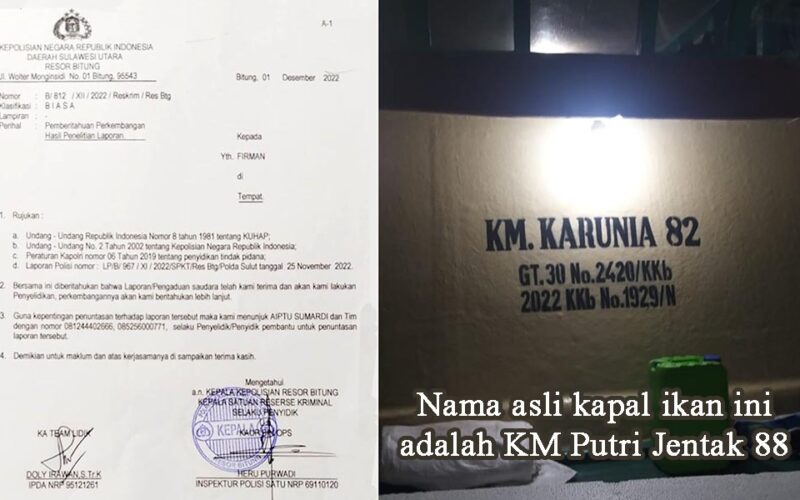 “Kapal saya itu sekarang ada di tangan oknum anggota polisi, kalau tidak salah namanya Roy Husain, yang berdinas di unit Propam Polres Bitung. Kapal itu dia beli dari orang yang membeli kapal saya secara kredit, bernama Randy Fresly Kamea,” ungkap Firman, pemilik kapal ikan dengan nama lambung KM Putri Jentak 88 kepada Ketua Umum PPWI, Wilson Lalengke, saat melaporkan kasusnya pada 29 Maret 2023.