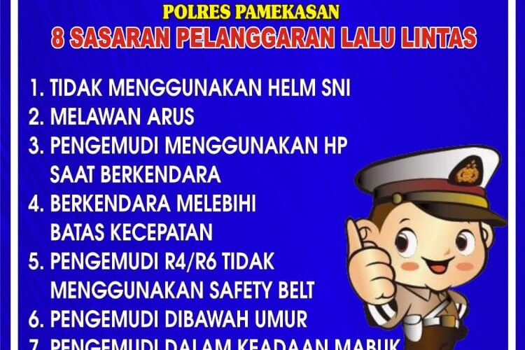 Delapan Pelanggaran yang menjadi prioritas antara lain, pengendara motor yang tidak menggunakan helm Standar Nasional Indonesia (SNI), melawan arus, pengemudi menggunakan HP saat berkendara, berkendaraan melebihi batas kecepatan, pengemudi R4/R6 tidak menggunakan safety belt, pengemudi di bawah umur, pengemudi dalam keadaan mabuk (miras maupun Narkoba) dan boncengan lebih dari satu.