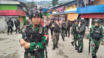 PIRNAS.COM | Tolikara – Demi terus menjaga situasi agar tetap kondusif dan mengantisipasi isu Profokatif dan aksi susulan dampak kejadian Wamena, Satgas Yonif Raider 142/KJ bersinergi dengan aparat kemanan setempat melakukan Apel dan patroli Gabungan TNI Polri Kabupaten Tolikara, bertempat di Pertigaan Jalan Irian Depan Gereja Yerusalem, Distrik Karubaga, Kabupaten Tolikara, Provinsi Papua Pegunungan, Rabu (8/3/2023)